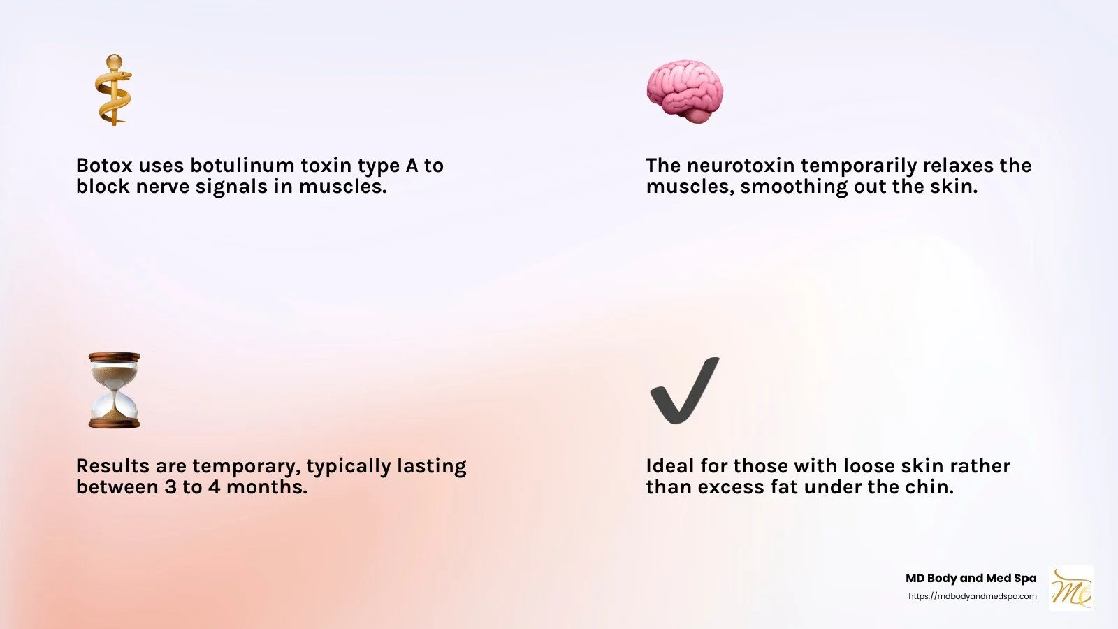 In short, Botox is a great option for those dealing with a double chin due to aging or muscle issues. However, it won't remove fat, so if your double chin is caused by excess fat, you might need to consider other treatments or a combination approach.