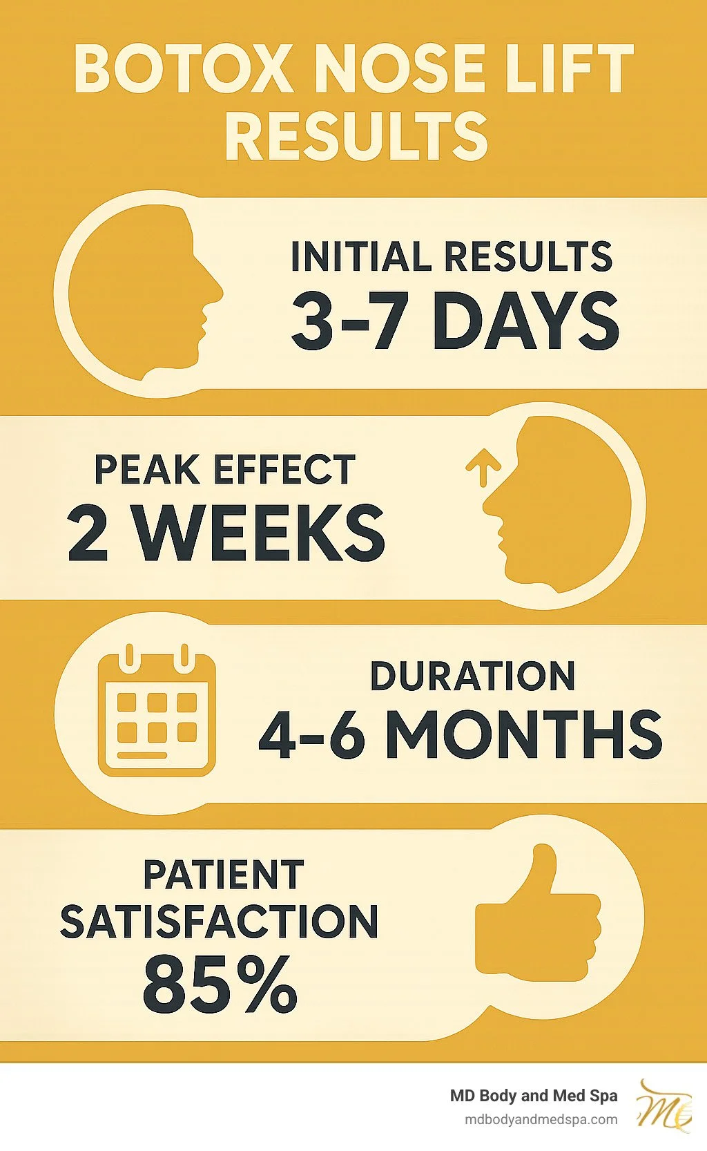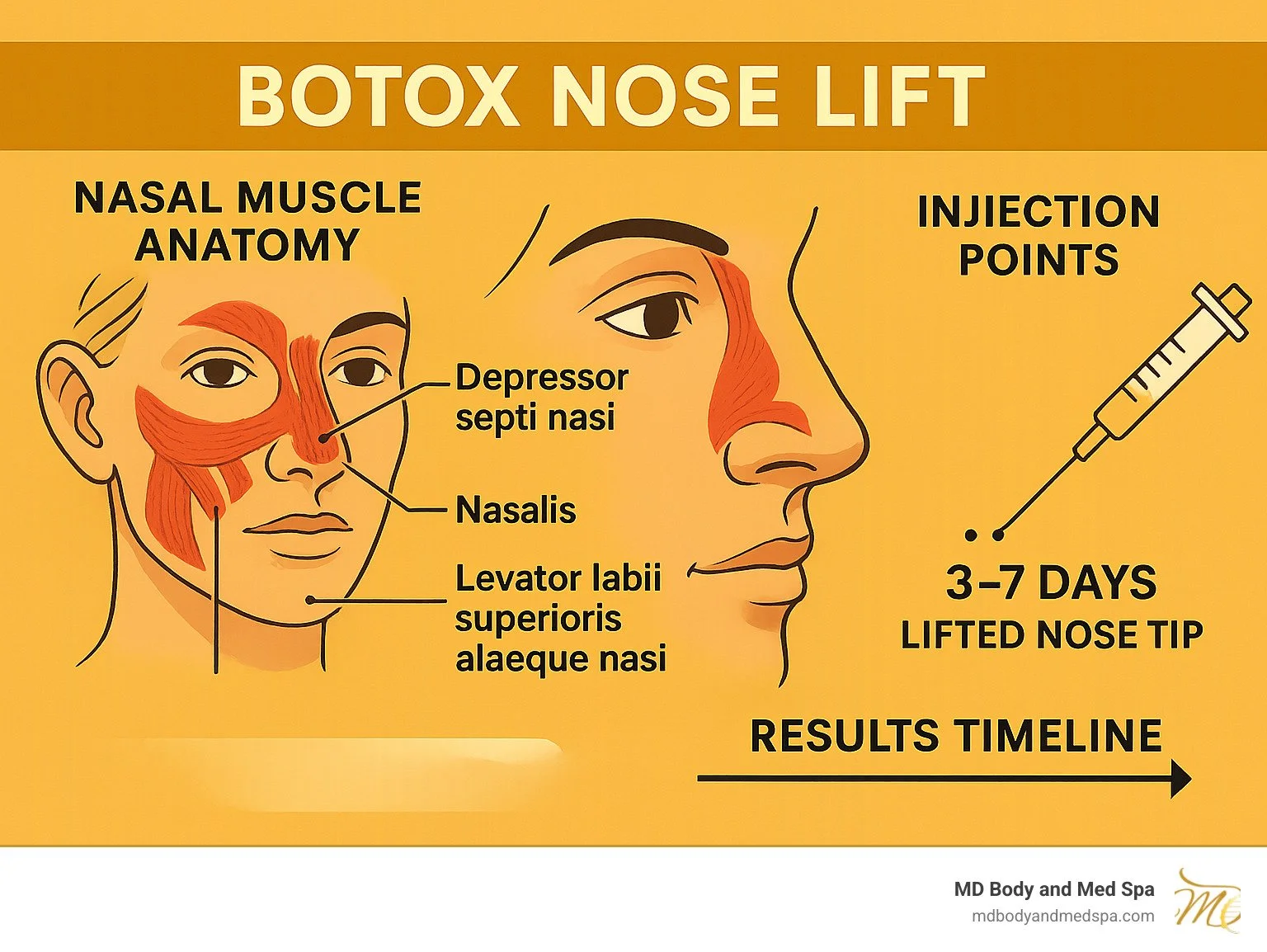 Quick Answer: What is a Botox Nose Lift? • Treatment: Botox injections into specific nasal muscles • Results: Lifted nose tip, reduced nostril flaring, smoothed bunny lines • Duration: 4-6 months per treatment • Downtime: Minimal - return to work same day • Cost: Significantly less than surgical rhinoplasty • Ideal for: Drooping tips, dynamic flaring, minor asymmetries