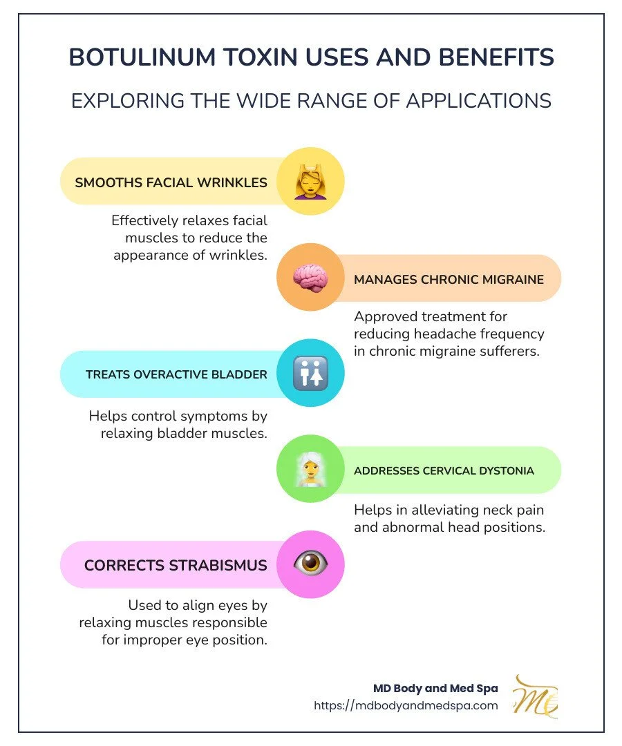 Medical Uses: Treats conditions like chronic migraines, cervical dystonia, and overactive bladder.