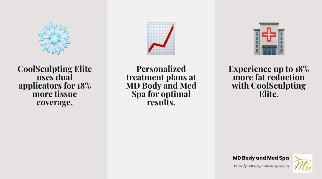 CoolSculpting Elite is the next generation of fat-freezing technology. It uses dual applicators to target more fat in less time. The applicators are 18% larger than the original CoolSculpting devices, which means more tissue coverage and better results in fewer sessions. With CoolSculpting Elite, you can expect up to 18% more fat reduction in the treated areas.