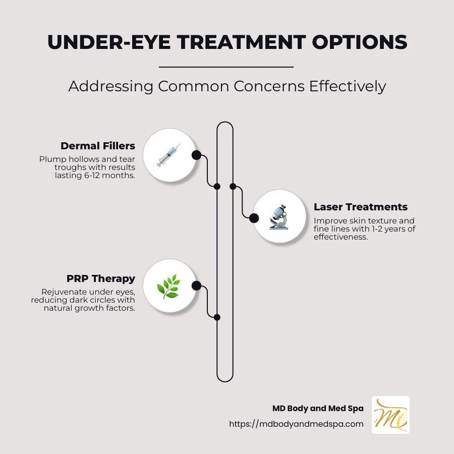Treatment TypeBest ForDuration of ResultsDermal FillersHollows, tear troughs6-12 monthsLaser TreatmentsSkin texture, fine lines1-2 yearsChemical PeelsPigmentation, mild wrinkles3-6 monthsPRP TherapyDark circles, overall rejuvenation6-12 monthsNon-Surgical Eye LiftsMild skin laxity6-18 months