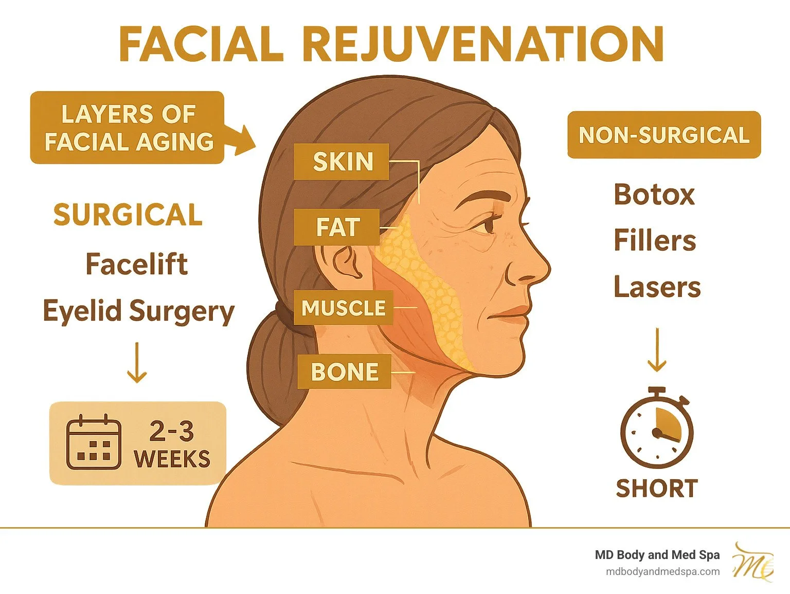 When it comes to turning back the clock on your appearance, you've got two main paths to consider: surgical or non-surgical facial rejuvenation. This choice isn't always straightforward and depends on several personal factors – how advanced your aging concerns are, the results you're hoping for, how much downtime you can manage, and of course, your budget.