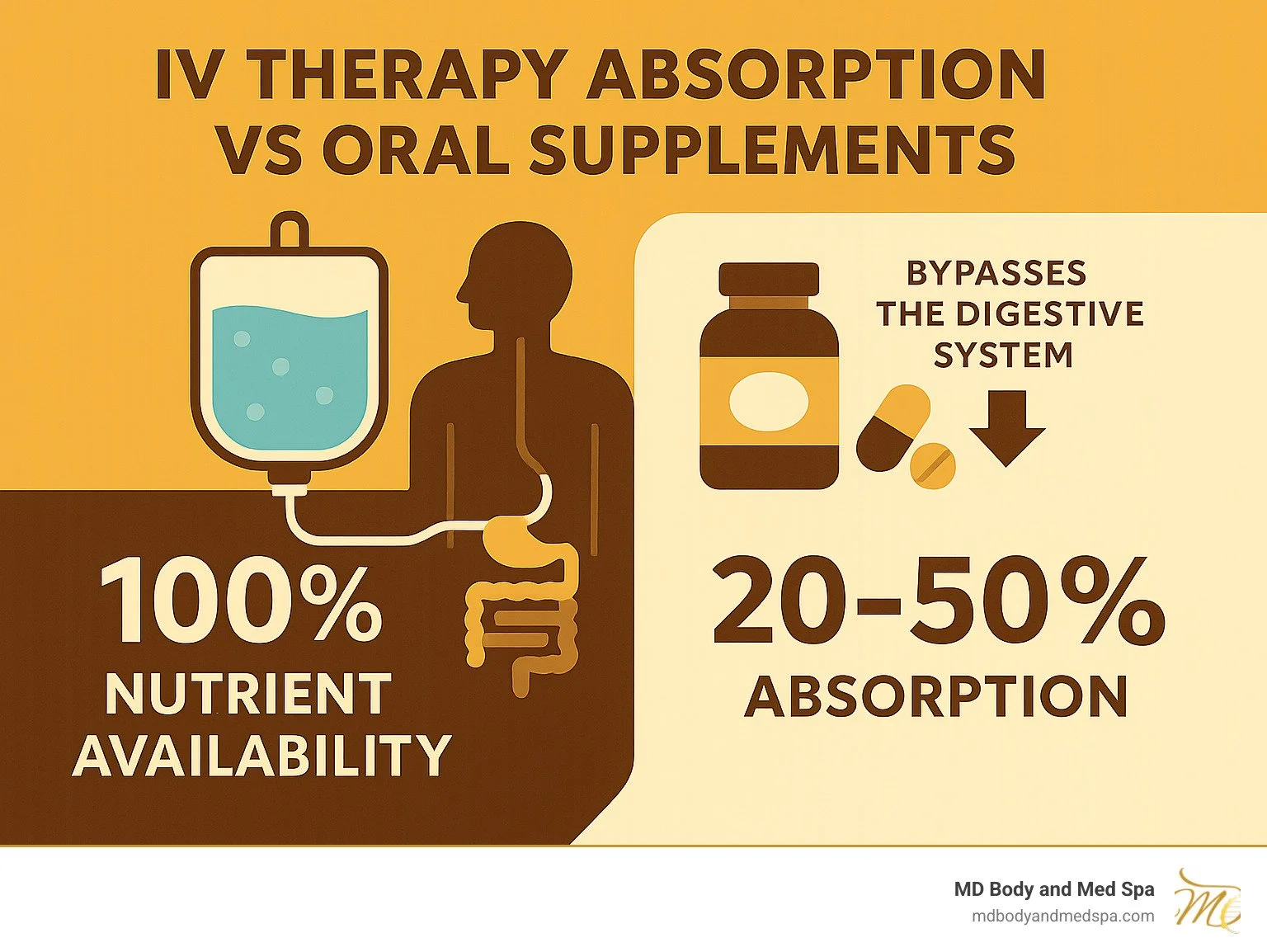 IV therapy delivers fluids, vitamins, minerals, and sometimes medications directly into your bloodstream, bypassing the digestive system for immediate absorption and effect. This approach can be particularly beneficial when your body is fighting infection or recovering from illness, as it ensures 100% nutrient absorption compared to the partial absorption achieved through oral supplements.