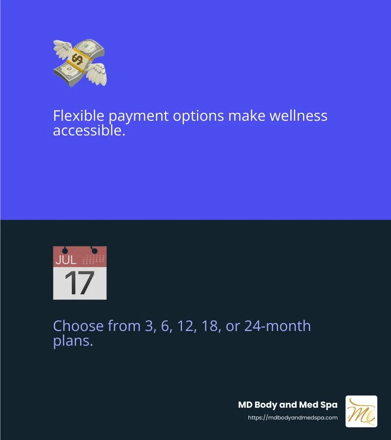 Wellness should be accessible to everyone. To make sure you can prioritize your health without financial strain, MD Body and Med Spa offers flexible payment plans. Through Cherry Payment Plans, you can split your treatment costs into manageable monthly payments. Choose from 3, 6, 12, 18, or 24-month options, with zero percent financing available for those who qualify.