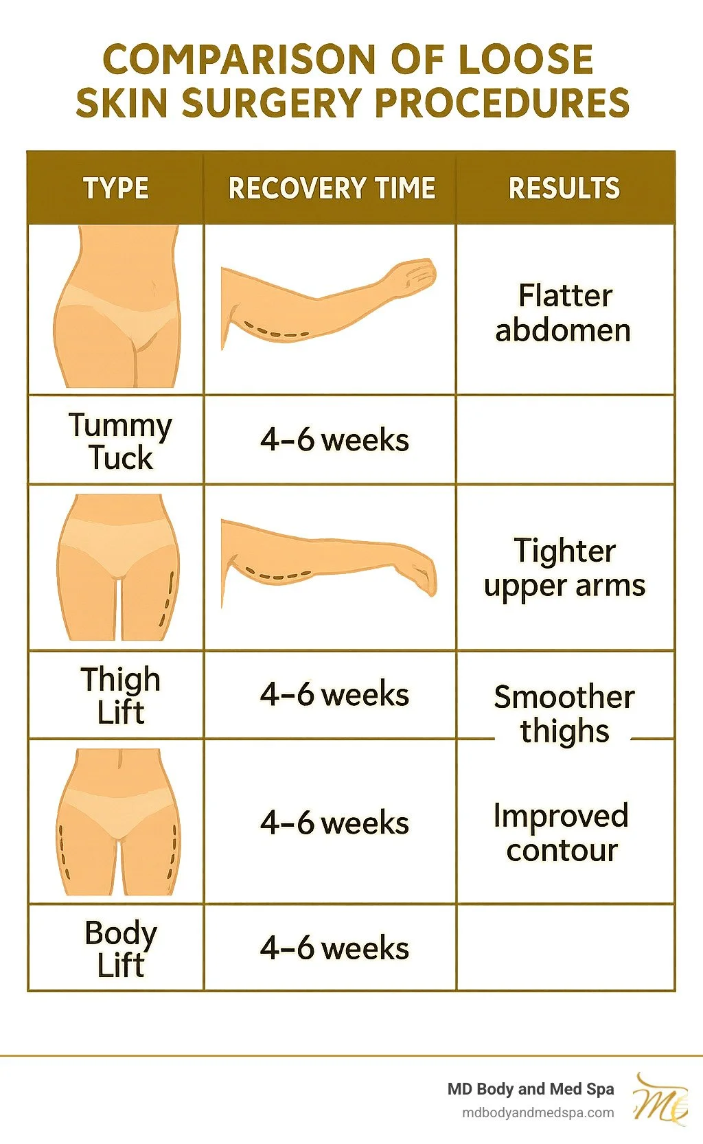 Loose skin surgery specifically refers to surgical procedures that remove excess skin. The most common types you'll encounter include: